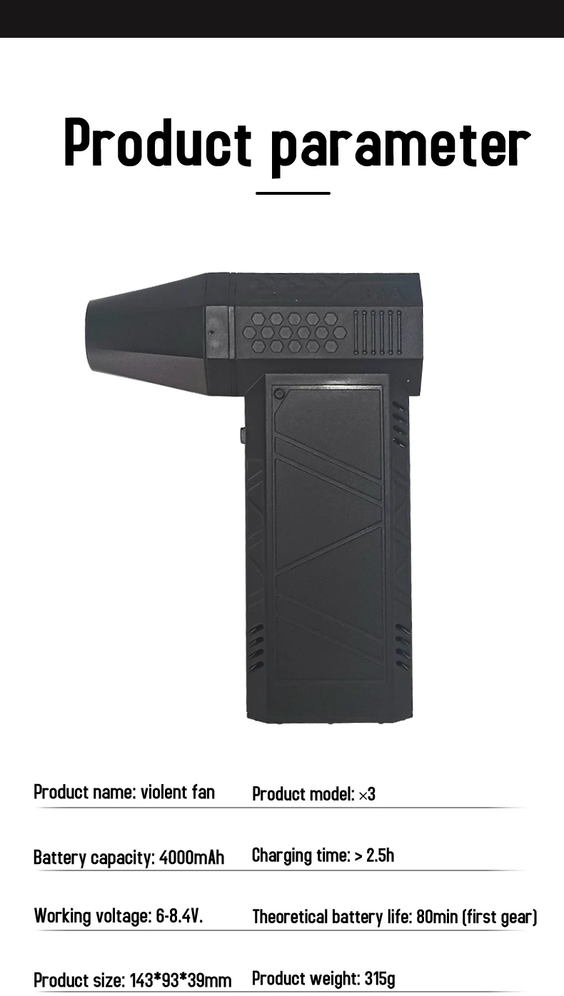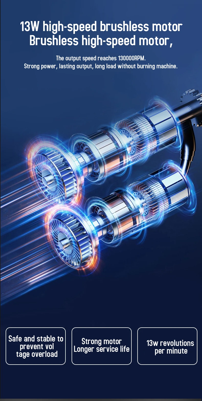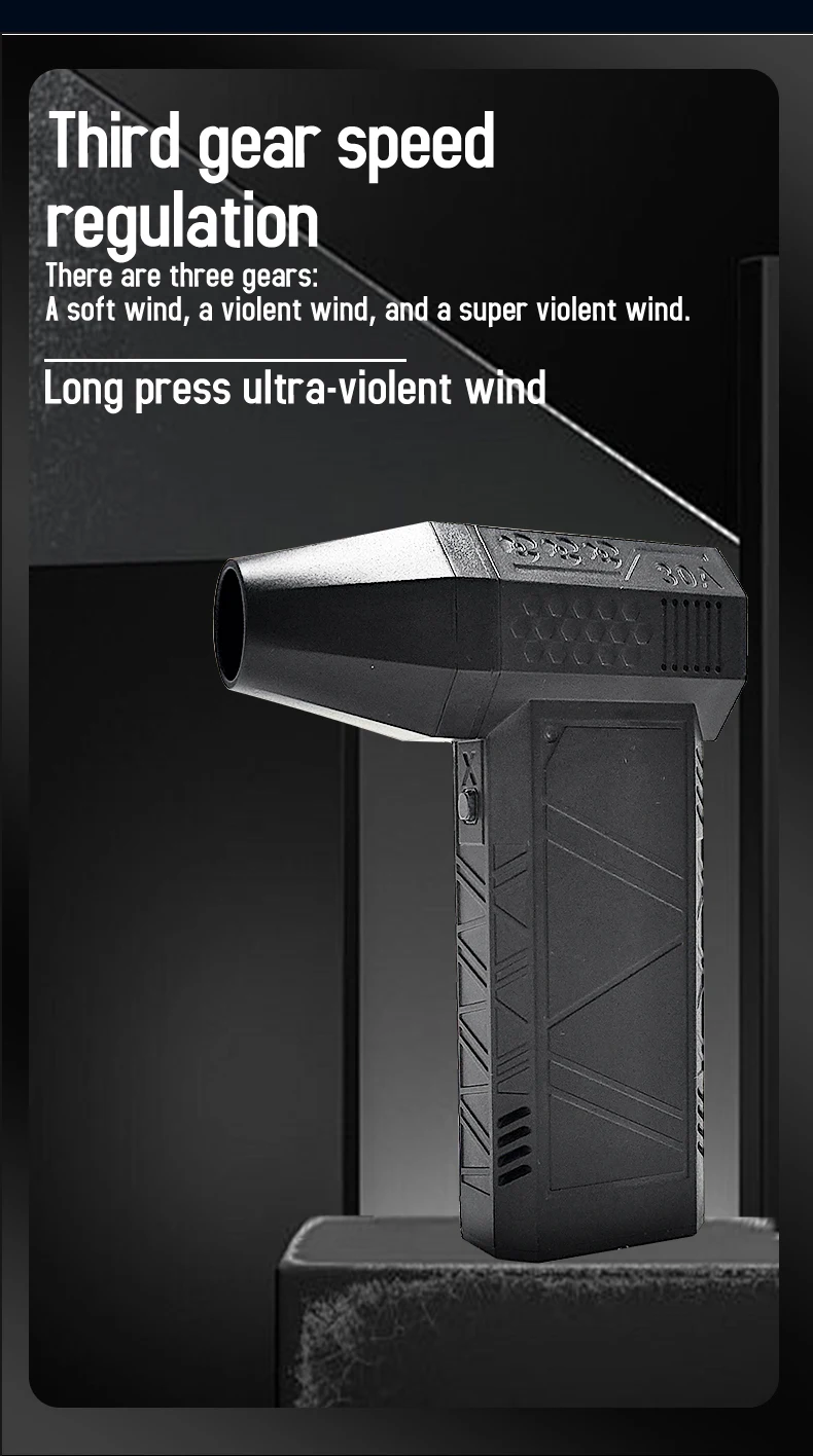 【Bürstenloser Motor & 130.000 U/min Hochgeschwindigkeit】: Der Ventilator wird von einem bürstenlosen Gleichstrom-Hochgeschwindigkeitsmotor mit starker Leistung angetrieben, die maximale Ausgangsgeschwindigkeit beträgt bis zu 130.000 U/min, was eine starke Windgeschwindigkeit von bis zu 52 Metern pro Sekunde erzeugt, kein Durchbrennen bei langer Belastung.