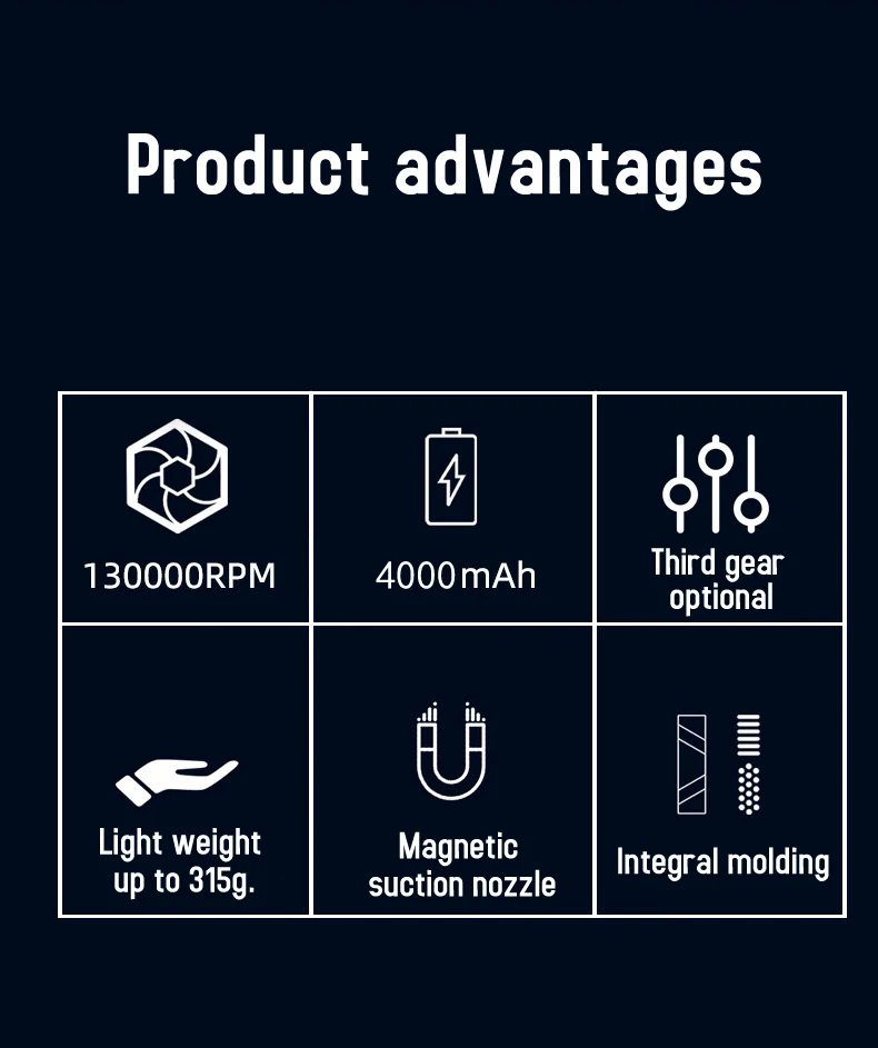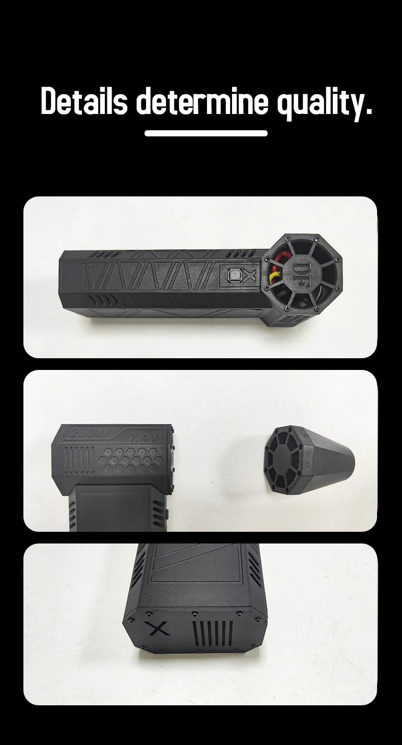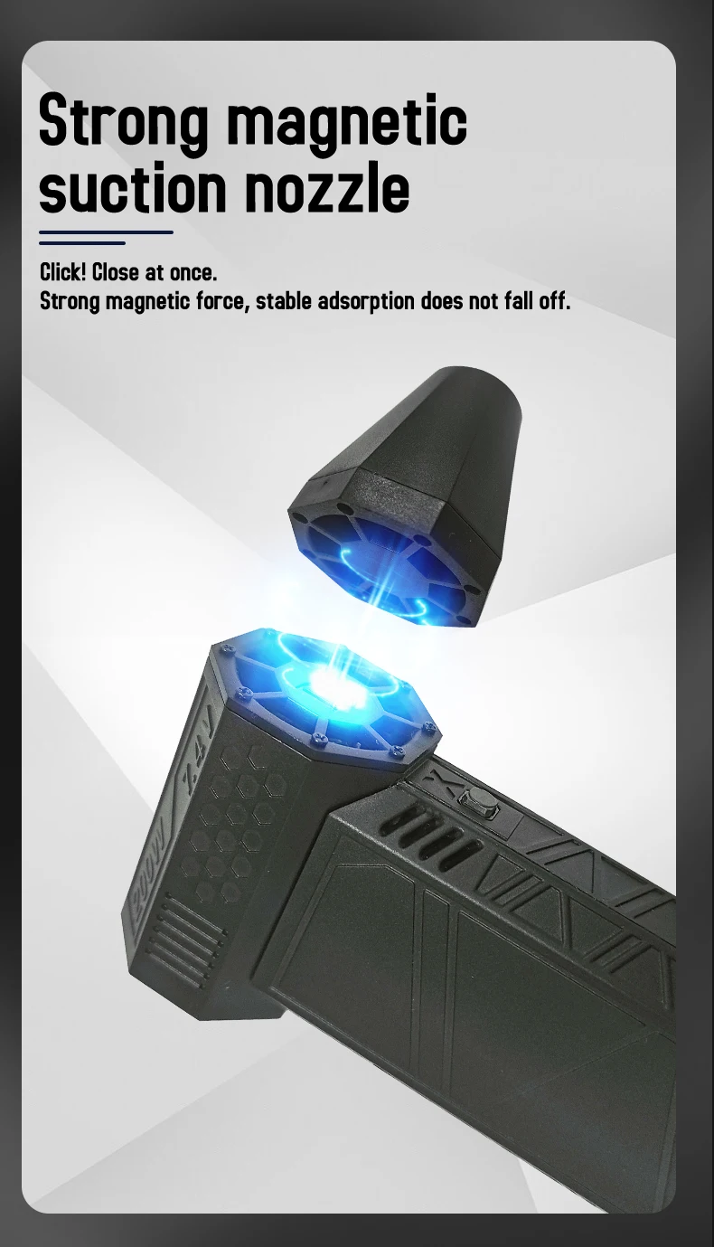 【Bürstenloser Motor & 130.000 U/min Hochgeschwindigkeit】: Der Ventilator wird von einem bürstenlosen Gleichstrom-Hochgeschwindigkeitsmotor mit starker Leistung angetrieben, die maximale Ausgangsgeschwindigkeit beträgt bis zu 130.000 U/min, was eine starke Windgeschwindigkeit von bis zu 52 Metern pro Sekunde erzeugt, kein Durchbrennen bei langer Belastung.